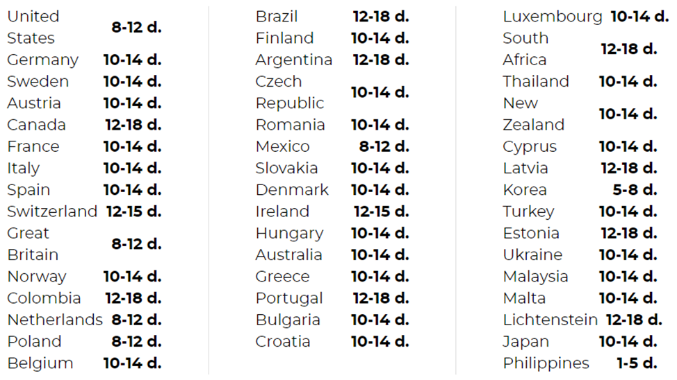We usually take about 1–2 business days to process your order. After that, you can expect the following delivery times, depending on your country: