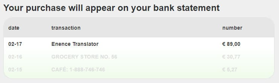 Om je te helpen je factuur correct te begrijpen, kun je de orderbevestiging controleren die we naar je e-mail hebben gestuurd. Deze zou alle benodigde gegevens moeten bevatten. Als je accessoires of extra's aan je bestelling hebt toegevoegd, worden deze als aparte kosten op je bankafschrift weergegeven. We hebben een screenshot bijgevoegd ter referentie.
